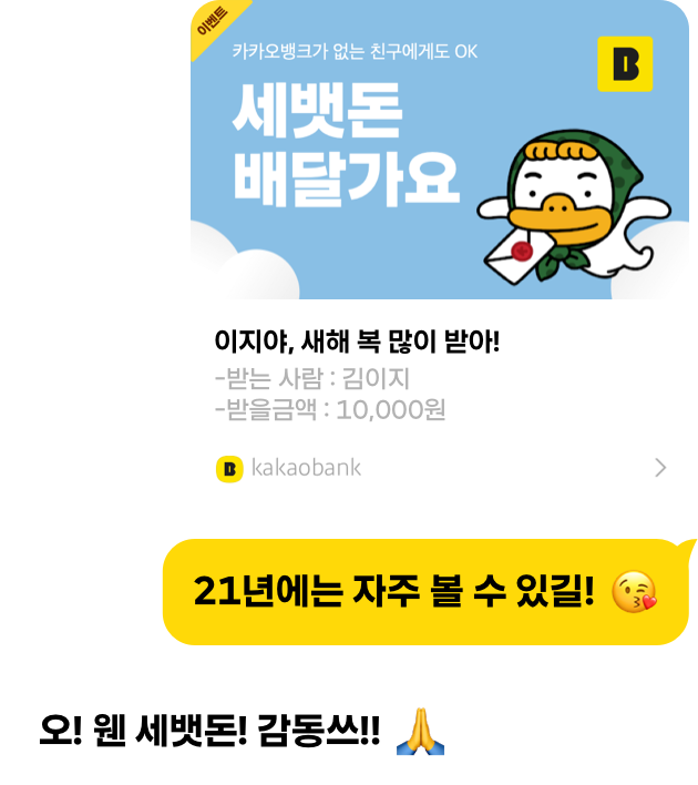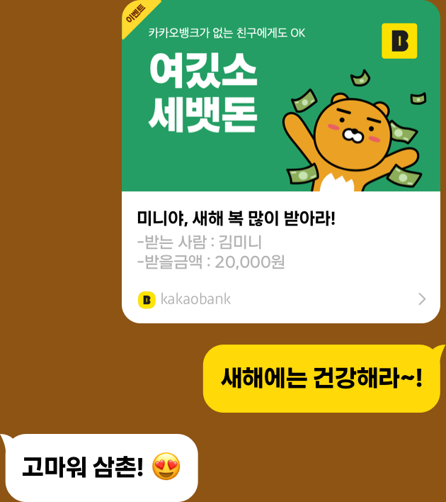 - '카카오톡 친구'에게 세뱃돈을 보내거나 받으면 경품 당첨 기회!