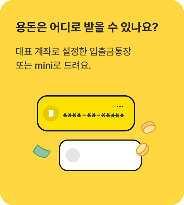 - 대표계좌 변경이 필요한 경우 [카카오뱅크 앱 > 입출금통장 또는 mini > 관리 > 설정 : 대표 계좌]에서 변경할 수 있습니다.