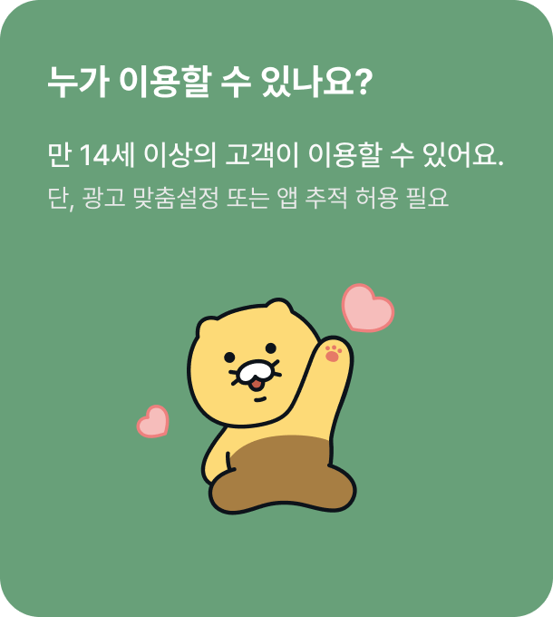 - ‘매일 용돈 받기’ 서비스는 만 14세 이상의 정상적인 카카오뱅크 입출금통장/mini를 보유한 고객만 참여 가능합니다.