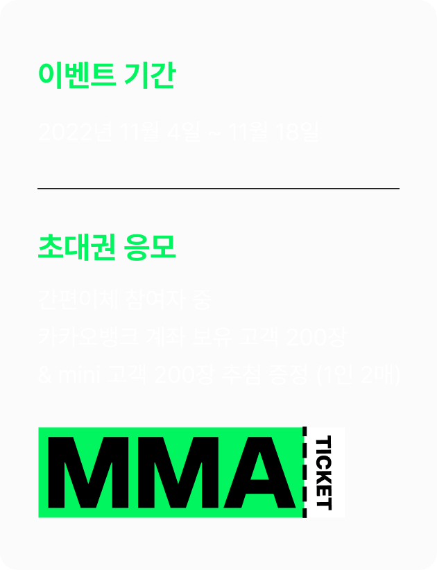 - 11월 11일 MMA2022 티켓 예매 시, 카카오뱅크 프렌즈 체크카드와 카카오뱅크 mini카드로만 결제 가능합니다.
