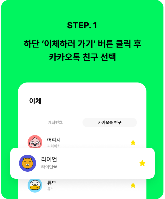 - 카카오뱅크 앱에서 '이체하러 가기' 버튼을 누른 뒤, '이체' > 카카오톡 친구’에서 ‘MMA 메시지카드' 를 이용하여 이체한 고객 중에 추첨을 진행합니다.